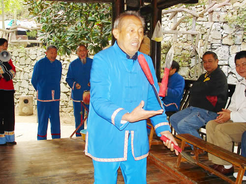 三棒鼓,是以拋三根棒和敲鑼打鼓得名,是土家山寨到處可見的一項以打擊樂器、口頭文學、表演技藝合為一體的文體活動形式。 打三棒鼓通常由三至五人組成,師傅擊鼓唱詞,一人打鑼,一人;ò簟⒒ǖ。由一人表演,將鼓架擺在前面鼓架上,將鑼掛在鼓架下面,用細繩系著鑼棒套在腳板上,表演時,口唱詞、手打鼓、腳踩鑼,鑼鼓節(jié)拍是按拋花棒、花刀速度的需要而定。三棒鼓的唱詞是五言四句重復半句組成。即五字一句,四句為一節(jié)。每小節(jié)的第四句要重復半句。每一小節(jié)擊響鑼鼓四遍。前三句是每唱完擊三響,最后一句唱完即每小節(jié)結(jié)束時擊響十下。例如唱:"學打三棒鼓",打"鏘鏘鏘";唱"學又學得苦",打"鏘鏘鏘";唱"三歲學到一十五",打"鏘鏘鏘";唱"學起呀,學起走江湖",打"鏘鏘鏘、鏘、鏘、鏘鏘鏘鏘鏘-鏘"。這一小節(jié),每唱一字為一拍,"鏘"為鑼鼓同鳴聲,每聲占一拍,標點符號也占一拍。每拍的快慢取決于花棒下落的速度,任何一個花棒下落一次均為一拍。因此,如果花棒拋得低,下落的頻率就快,每拍所占時間就短,反之,花棒拋得高,每拍占的時間就長。三棒鼓的第二句和第四句都要求壓韻,一句和三句可壓可不壓. 打三棒鼓的技巧性很強,思想要高度集中,拋刀拋棒用力要適度,動作要敏捷準確,稍有疏忽大意,不但表演失敗,還會被刀劃破手腳或誤傷他人。因此,凡是學打三棒鼓者,均需經(jīng)常練習飛拋接技術(shù),做到閉目均能拋接刀棒。因此,土家族青少年經(jīng)常用三個卵石練習拋接技術(shù),久而久之,熟能生巧,不但會拋棒,而且能拋刀。 打三棒鼓的鑼鼓曲牌不變,但唱詞多種多樣,除了固定的《十二月花》等唱詞外,均為即興編詞隨口而唱,唱三棒鼓歌的人,都是腦筋靈活、口才伶俐者。 |