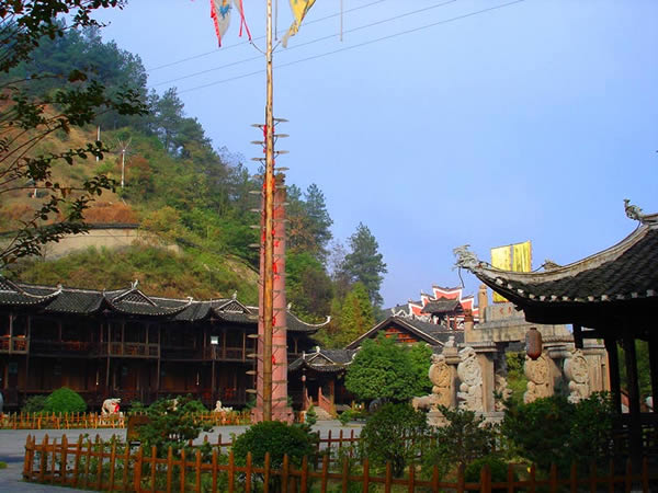 土司城 土司制度初建于五代十國時(shí)期,到了明朝己非常成熟了,土司王有無上的權(quán)威,在湘西有三大土司王分別是桑植土司向氏、永順土司王彭氏、慈利土司王張氏,其中又以永順溪州土司彭氏實(shí)力最強(qiáng)。其它土司王都為自己修建一座土司城,唯有彭氏分別在永定、永順修建了二座土司城。在永定的土司城內(nèi),彭氏為顯示其地位,修建了湘西最高的一座高達(dá) 48米,共12層的吊腳樓,整棟樓竟無一根鐵釘,堪稱土家吊腳樓建筑史上的奇跡,此樓于2002年9月被評為最高吊腳樓,榮獲世界吉尼斯之最,與此同時(shí)土司城內(nèi)舉辦一千人參加表演的毛古斯舞蹈活動獲得圓滿成功,同時(shí)獲得世界吉尼斯之最。進(jìn)入土司城,首先看到土司城迎賓儀式,土家漢子迎賓鼓,吹牛角、放沖,土家姑娘攔門歌,敬攔門酒,進(jìn)入城內(nèi),在祭祀堂前舉行百人土家大祭祖活動,男女老少唱擺手歌、跳擺手舞,登世界最高的吊腳樓九重天,參觀土家族千百年來文化展示。到土家山寨,聽土家歌,賞土家族最有代表風(fēng)俗哭嫁,三棒鼓,花燈等民俗表演。
