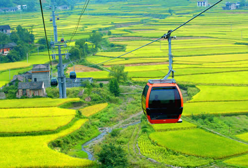 天門山索道途經的美麗田園 天門山索道最大的亮點就是它的爬坡面支架的設計 ,這個支架共有壓索輪96個,托索輪16個,它綜合了現(xiàn)代物理學、現(xiàn)代工程學、現(xiàn)代制造業(yè)中最先進的理論和成果,應用了世界最先進的索道技術,從而使這段索道總給人一種蕩氣回腸、氣勢沖天的感覺。