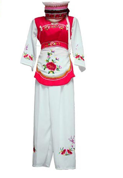 “崇尚白色”是白族人的一個明顯特點。不論男女都愛穿白色服飾,故有“要得俏,一身孝”之說,過去穿戴的白布又稱“家布機(jī)”,是白族人自己種棉花,自己紡紗,自己用土機(jī)織,用土法洗漂而成,其服飾美觀大方。一般來說,男子戴五尺、七或九尺的白布頭巾。上穿白色對襟布扣汗衣,外套青色滿肩馬褂,腰系桃花兜,并配撤穗荷包,下著青色寬腳褲,腳穿白布襪子和天官云頭鞋。婦女頭上蒙白色繡花帕,兩耳垂環(huán),手戴鐲子或戒指,外套繡花圍裙,用繡花飄帶系著,右上胸佩掛三吊或五吊銀質(zhì)牙簽。下著蘭色寬褲,腳纏白色裹腳布,穿繡花尖尖鞋。無婚女性則挽“簪巴”,挽于腦后的稱“粑粑”,挽于頭頂?shù)姆Q高把簪,簪上套有網(wǎng),橫插簪子;兒童衣服多繡花,外圍肚兜,頭戴虎頭鼓針菩薩帽,頸戴“項圈”、“百家鎖”等,手腕套有銀圈,上系小吊,吊上有錘、鈴、鞋、斧、簽等。