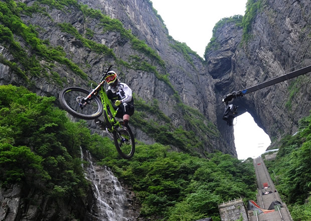 張家界天門山天門洞,999級臺階,以39°斜坡筆直往下,看一眼都覺得眩暈。如果有人騎著山地車一路沖下來,你一定會說“瘋了!”。