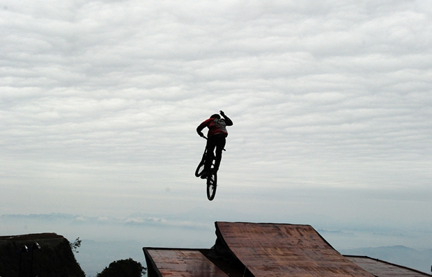 沿用去年的賽制,本屆大賽依舊分速度賽和技巧賽。速度賽的賽道出發(fā)點(diǎn)為天門洞口,選手將俯沖騎行整條天梯,并且全程直線加速,再騰空飛躍跨度超過7米、高差超過4米的跳臺最終騎行至天門洞廣場,時(shí)間最短者為勝。技巧賽為選手通過天梯上的加速跳臺起跳,跳臺呈現(xiàn)4.5米弧度仰角,選手會被拋至空中,完成后空翻、超人、神龍擺尾等難度動作,落地后,再通過2米高,跨度超過7米拋臺,空中完成第二次難度動作,裁判將以兩次空中動作難度和落地完成情況為基本項(xiàng)要求評分。