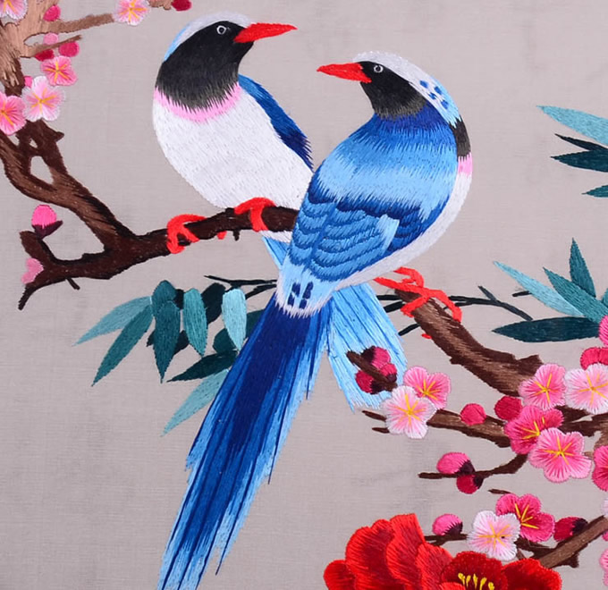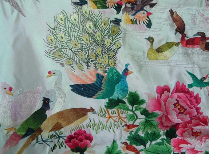 湘繡主要以純絲、硬緞、軟緞、透明紗和各種顏色的絲線、絨線繡制而成。其特點(diǎn)是:構(gòu)圖嚴(yán)謹(jǐn),色彩鮮明,各種針法富于表現(xiàn)力,通過豐富的色線和千變?nèi)f化的針法,使繡出的人物、動物、山水、花鳥等具有特殊的藝術(shù)效果。在湘繡中,無論平繡、織繡、網(wǎng)繡、結(jié)繡、打子繡、剪絨繡、立體繡、雙面繡、亂針繡等等,都注重刻畫物象的外形和內(nèi)質(zhì),即使一鱗一爪、一瓣一葉之微也一絲不茍。 從1958年長沙楚墓中出土的繡品看,早在二千五百多年前的春秋時代,湖南地方刺繡就已有一定的發(fā)展。一九七二年又在長沙馬王堆西漢古墓中出土了四十件刺繡衣物,說明遠(yuǎn)在二千一百多年前的西漢時代,湖南地方刺繡已發(fā)展到了較高的水平。此后,在漫長的發(fā)展過程中,逐漸培養(yǎng)了質(zhì)樸而優(yōu)美的藝術(shù)風(fēng)格。隨著湘繡商品生產(chǎn)的發(fā)展,經(jīng)過廣大刺繡藝人的辛勤創(chuàng)造和一些優(yōu)秀畫家參與湘繡技藝的改革提高,把中國畫的許多優(yōu)良傳統(tǒng)移植到繡品上,巧妙地將我國傳統(tǒng)的繪畫、刺繡、詩詞、書法、金石各種藝術(shù)融為一體,從而形成了湘繡以中國畫為基礎(chǔ),運(yùn)用七十多種針法和一百多種顏色的繡線,充分發(fā)揮針法的表現(xiàn)力,精細(xì)入微地刻劃物象外形內(nèi)質(zhì)的特點(diǎn),繡品形象生動逼真,色彩鮮明,質(zhì)感強(qiáng)烈,形神兼?zhèn),風(fēng)格豪放,曾有“繡花花生香,繡鳥能聽聲,繡虎能奔跑,繡人能傳神”的美譽(yù)。