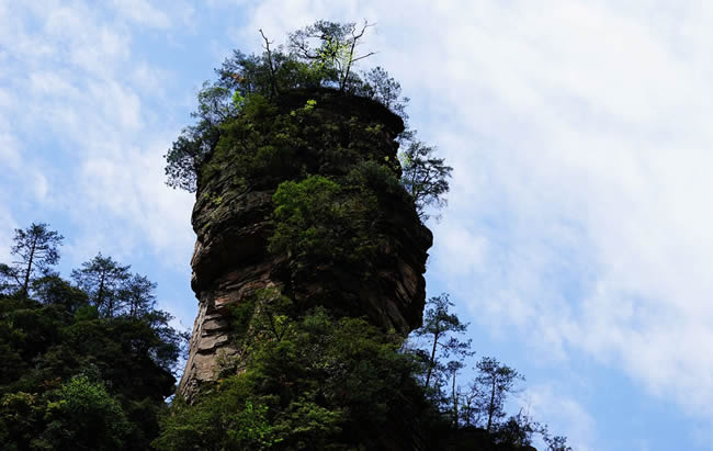 “去年古怪少,今年古怪多。先生我,后生哥,河里石頭滾上坡”,這是民間《古怪歌》里的幾句歌詞,它專唱世上違反常規(guī)的怪人和怪事。在楊家界有一見怪事,有一處石峰絕壁上,一無土,二無縫,三無罅,四無水,卻長出三株靈樹,取名“靈樹咬石”。三株靈樹緊緊咬住石壁不入,頑強生長,而且長得老干虬枝,古撲蒼勁,枝繁葉茂,高于云表!三株靈樹,身處險境,久旱不枯,狂風(fēng)不倒,顯示了強大的生命力。你說怪不怪,你看奇不奇?