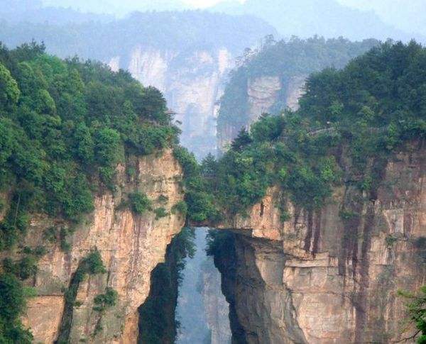 “后花園”至天下第一橋,有一條全長2000多米的游道,路面多為白色的條石鋪成,站在遠處觀望,很像一條白色的綢帶打了兩個結(jié),一頭系在“迷魂臺”,一頭第在“天下第一橋”。信步漫游,沿途可欣賞到“拜仙臺”、“百丈絕壁”、“小洞天”、“情人谷”等別有情趣的景點,這里海拔不高,一般不受氣候影響,慢慢品味,定會使您賞心悅目!疤煜碌谝粯颉笔菑埣医纭笆蠼^景”之一。也是袁家界的標(biāo)志性景點,它是居于兩山之間形成的一座天然石橋,而兩山原為一體,橋身是兩山相連的關(guān)鍵部分,但因中間石質(zhì)較為薄弱,由于風(fēng)化、崩塌作用的影響,又經(jīng)過日曬雨淋、流水洗刷、山洪沖擊,久而久之,終于形成今天這一特別的奇景……。自杉刀溝上袁家界,沿絕壁頂部邊緣遨游,至于中坪“觀橋臺” 遙望千米之外,只見一天然石橋凌空飛架兩峰之巔,氣勢磅礴,奇?zhèn)ソ^倫,被稱為“天下第一橋”。石橋?qū)拑H3米,厚5米,跨度約50米,相對高度近400米。天下第一橋與夫妻巖并稱“張家界雙絕”。“天下第一橋”橋面寬兩米,厚四米,跨度為二十多米,高度為三百多米,是世界是迄今為止所發(fā)現(xiàn)落差最高的天然石橋。