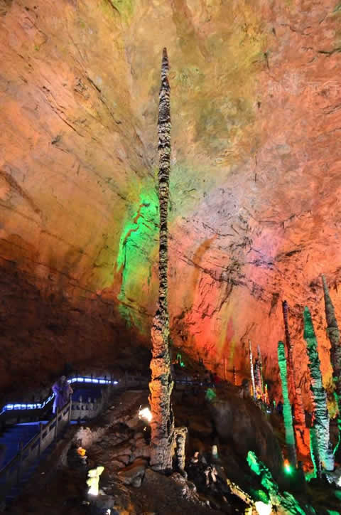跨過中國游覽洞穴中跨度最大的石拱橋天仙橋,便進入黃龍洞第三層天柱街了。天柱街是天上的街市,是神仙做生意的地方。天柱街以繁華似錦、春意盎然的“天上街市”為中心,西街花果山石柱石花重重疊疊,東街“天堂宮” 穹形洞頂高大幽深。順著長長的崩塌的斜坡往上看,兩根大石柱及壁流石被地下水溶蝕形成了奇妙的空洞,因從不同的地方可以敲出奇妙而悅耳的音符得名“石琴山”。一九八四年,中央電視臺拍攝電視專題片《地下明珠——黃龍洞》的時候,就是在這兩根石柱上敲擊出了一曲完整的《賣報歌》。