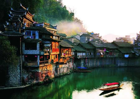 【鳳凰古城位于沱江之畔、群山環(huán)抱、關(guān)隘雄奇、碧綠的沱江依著城墻緩緩流淌,疊翠的南華山麓倒映江中,江中漁舟游船數(shù)點(diǎn),山間暮鼓晨鐘兼鳴,懸崖上的吊腳樓輕煙裊裊,碼頭邊的浣紗姑笑聲朗朗,兩岸已有數(shù)百年歷史的吊腳樓更是別有一番風(fēng)味;順?biāo)麓┻^虹橋一幅江南水鄉(xiāng)的畫面便展現(xiàn)于眼前--萬(wàn)壽宮、萬(wàn)名塔、奪翠樓……一種遠(yuǎn)離塵世的感覺悠然而生;鳳凰--猶如“一幅濃墨淺彩的中國(guó)山水畫”】(游覽時(shí)間約3小時(shí)左右)